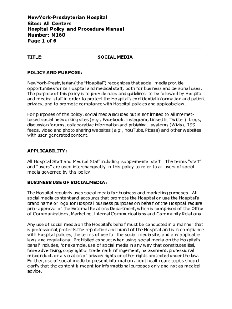 NewYorkPresbyterian Hospital Sites: All Centers Hospital Policy and Procedure Manual Number: M160 Page 1 of 6 ___ TITLE:SOCIAL MEDIAPOLICY AND PURPOSE: NewYorkPresbyterian (the Hospital) recognizes
