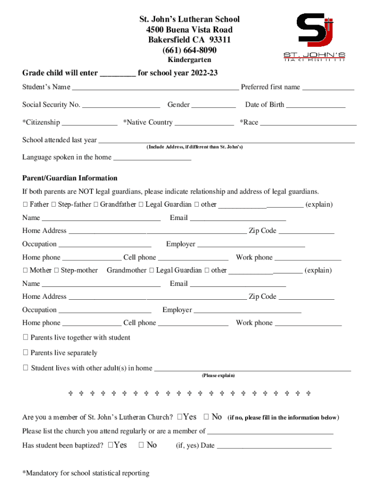 St. Johns Lutheran School 4500 Buena Vista Road Bakersfield CA 93311 (661) 6648090 KindergartenGrade child will enter ___ for school year 202223 Students Name ___ Preferred first name ___ Social Security