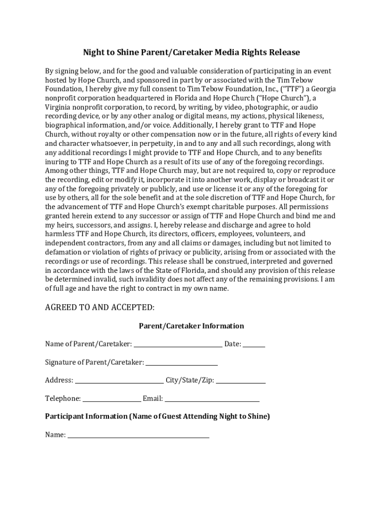 Get the free Night to Shine Parent/Caretaker Media Rights Release