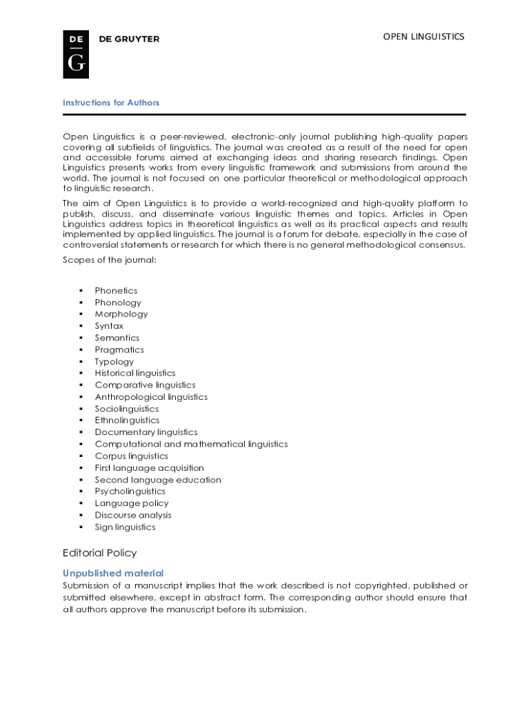 OPEN LINGUISTICSInstructions for AuthorsOpen Linguistics is a peer reviewed, electronic only journal publishing high quality papers covering all subfields of linguistics. The journal was created as