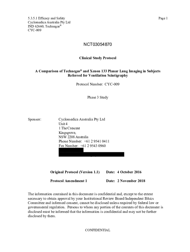 5.3.5.1 Efficacy and Safety Cyclopedia Australia Pty Ltd IND 62660; Technical CYC009Page 1NCT03054870 Clinical Study Protocol A Comparison of Technical and Xenon 133 Planar Lung Imaging in Subjects