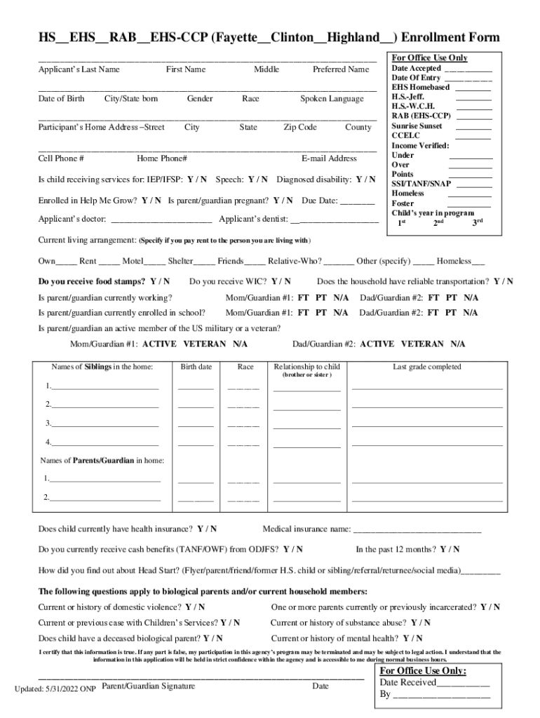 HS__EHS__RAB__EHSCCP (Fayette__Clinton__Highland__) Enrollment Form ___ Applicants Last Name First Name Middle Preferred Name ___ Date of Birth City/State born Gender Race Spoken Language ___ Participants