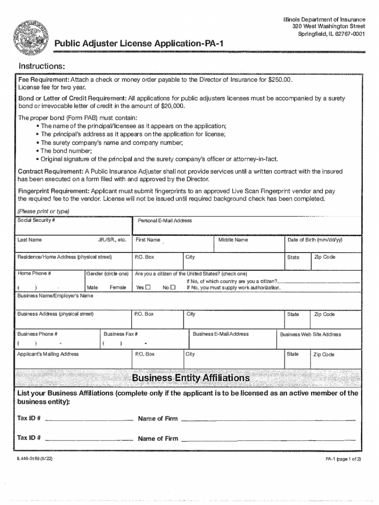 , Public Adjuster license ApplicationPA1Illinois Department of Insurance 320 West Washington Street Springfield, IL 627670001Instructions: Fee Requirement: Attach a check or money order payable to