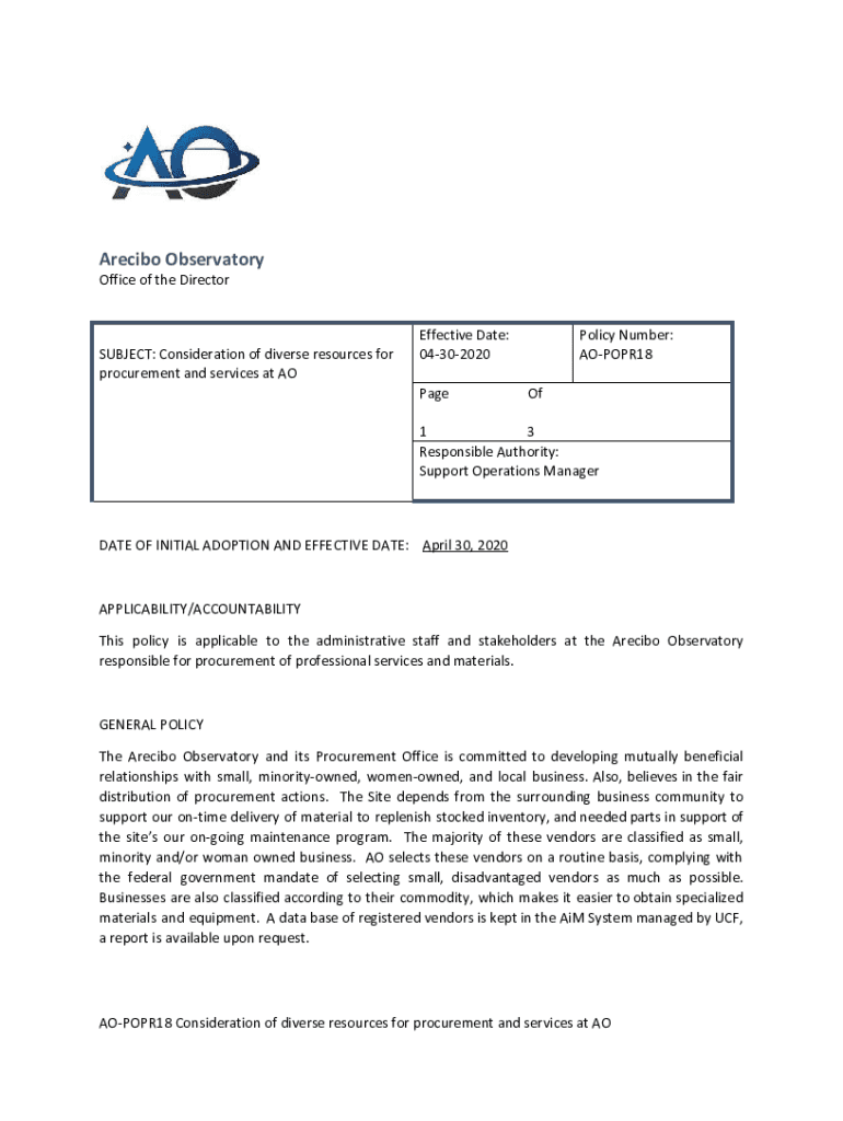 Arecibo Observatory Office of the DirectorSUBJECT: Consideration of diverse resources for procurement and services at Effective Date: 04302020 PagePolicy Number: AOPOPR18 Of1 3 Responsible Authority: