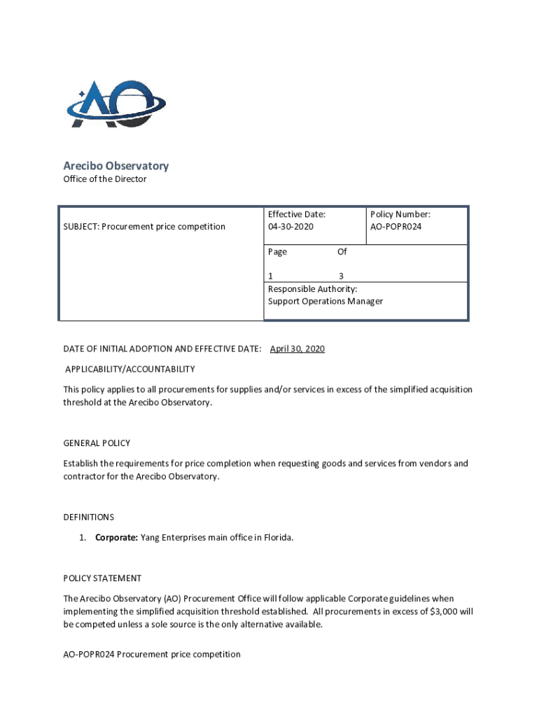 Arecibo Observatory Office of the DirectorSUBJECT: Procurement price competitionEffective Date: 04302020 PagePolicy Number: AOPOPR024 Of1 3 Responsible Authority: Support Operations Managerial OF