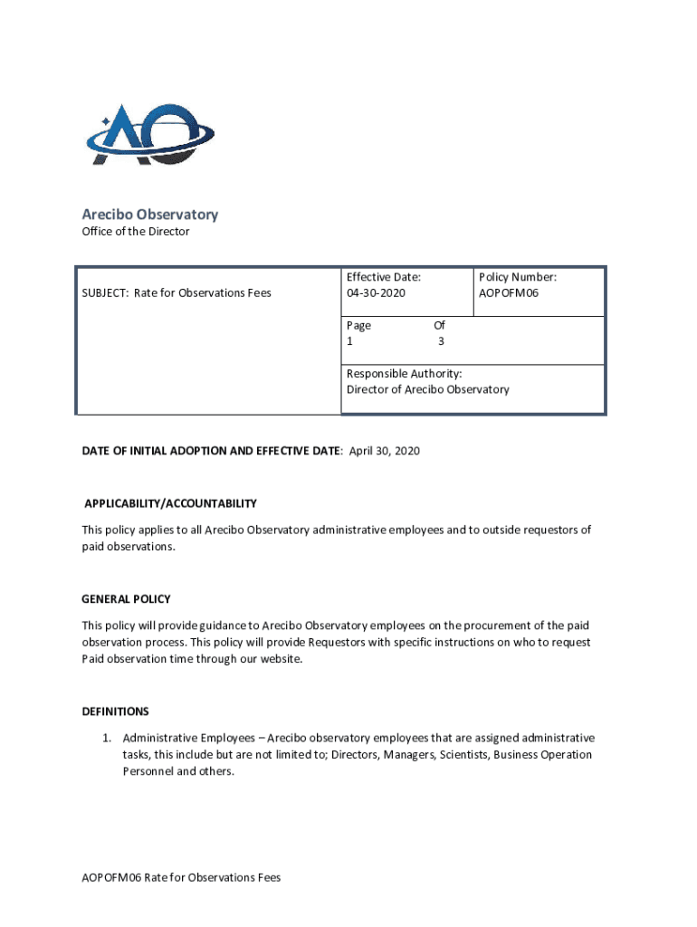 Arecibo Observatory Office of the DirectorSUBJECT: Rate for Observations FeesEffective Date: 04302020 Page 1Policy Number: AOPOFM06 Of 3Responsible Authority: Director of Arecibo ObservatoryDATE OF