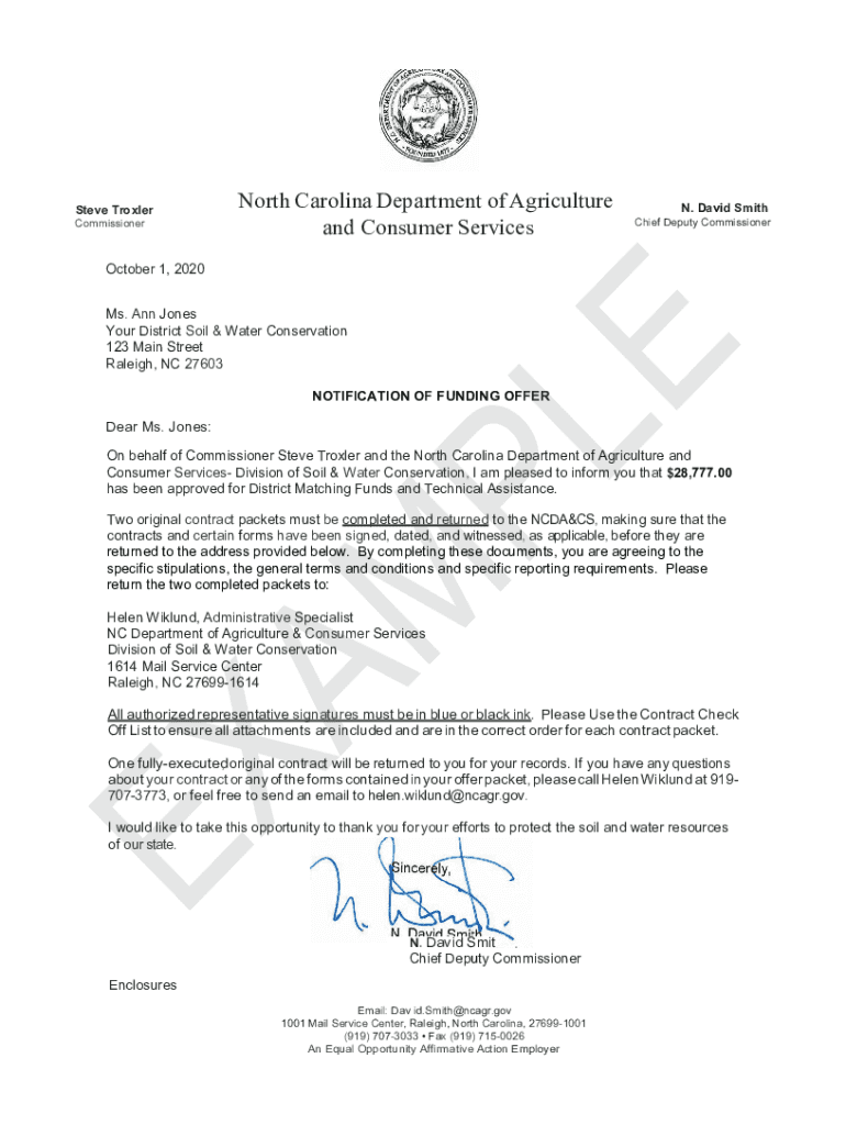 Steve TroxlerCommissionerNorth Carolina Department of Agriculture and Consumer Services. David Mischief Deputy Commissioner October 1, 2020, Ms. Ann Jones Your District Soil & Water Conservation 123