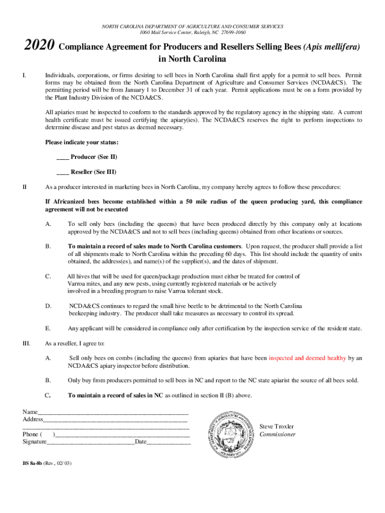 NORTH CAROLINA DEPARTMENT OF AGRICULTURE AND CONSUMER SERVICES 1060 Mail Service Center, Raleigh, NC 2769910602020 Compliance Agreement for Producers and Resellers Selling Bees (APIs mellower) in