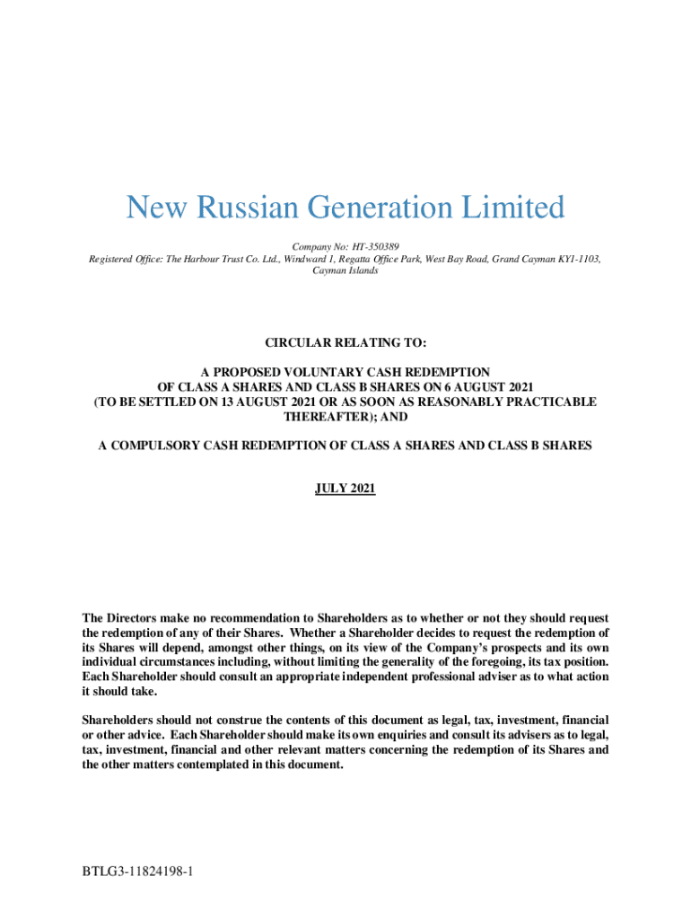 New Russian Generation Limited Company No: HT350389 Registered Office: The Harbor Trust Co. Ltd., Windward 1, Regatta Office Park, West Bay Road, Grand Cayman KY11103, Cayman IslandsCIRCULAR RELATING