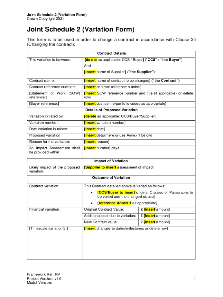 Get the free Joint Schedule 2 (Variation Form) - Crown Commercial Service