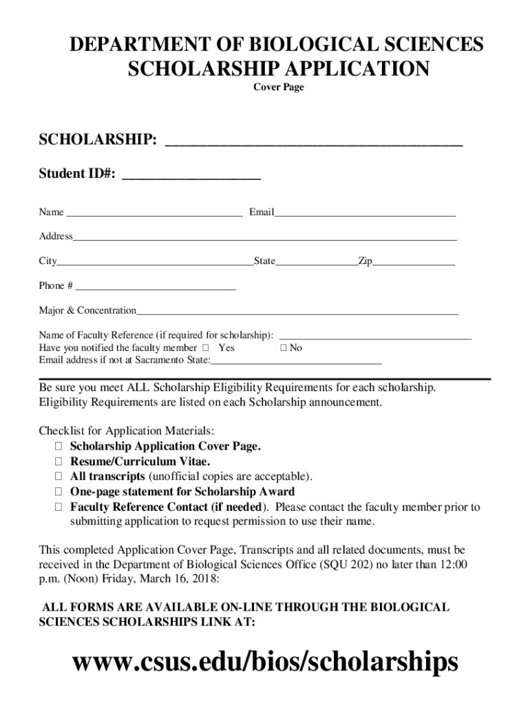 DEPARTMENT OF BIOLOGICAL SCIENCES SCHOLARSHIP APPLICATION Cover PageSCHOLARSHIP: ___ Student ID#: ___ Name ___ Email___ Address___ City___State___Zip___ Phone # ___ Major & Concentration___ Name of