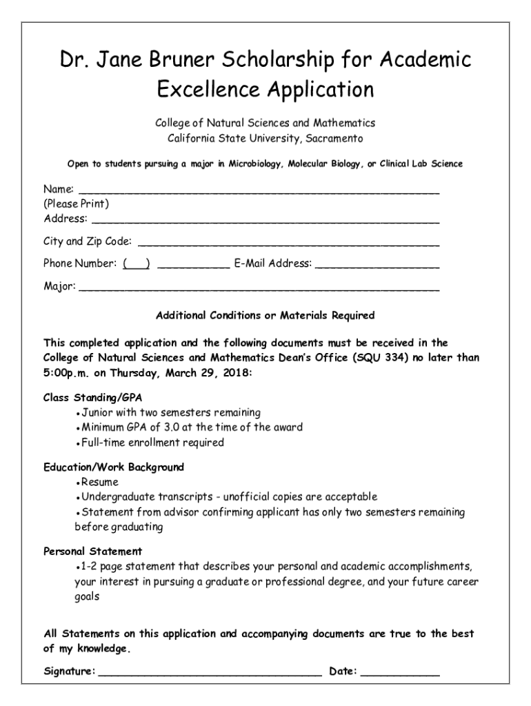 Dr. Jane Brunei Scholarship for Academic Excellence Application College of Natural Sciences and Mathematics California State University, Sacramento Open to students pursuing a major in Microbiology,