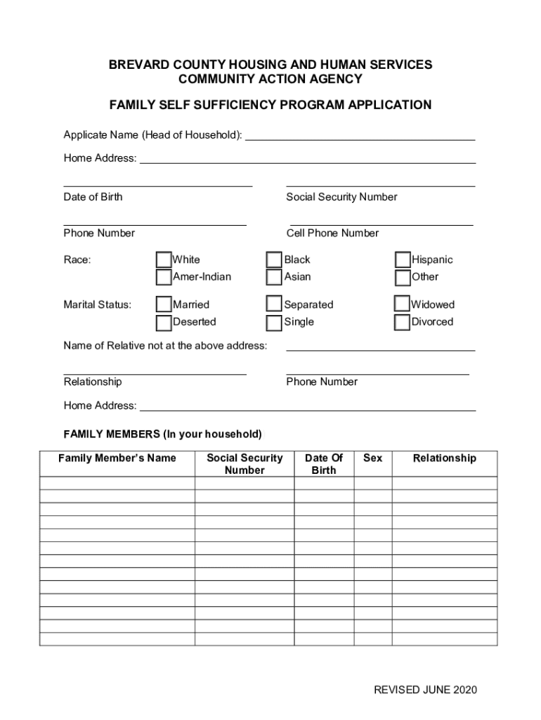 BREVARD COUNTY HOUSING AND HUMAN SERVICES COMMUNITY ACTION AGENCY FAMILY SELF SUFFICIENCY PROGRAM APPLICATION Applicable Name (Head of Household): ___ Home Address: ___ ___ Date of Birth___ Social