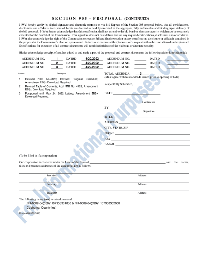 S E C T I O N 9 0 5 P R O P O S A L (CONTINUED) I (We) hereby certify by digital signature and electronic submission via Bid Express of the Section 905 proposal below, that all certifications, disclosures