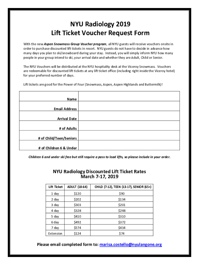 NYU Radiology 2019 Lift Ticket Voucher Request Form With the new Aspen Snow mass Group Voucher program, all NYU guests will receive vouchers onsite in order to purchase discounted lift tickets in