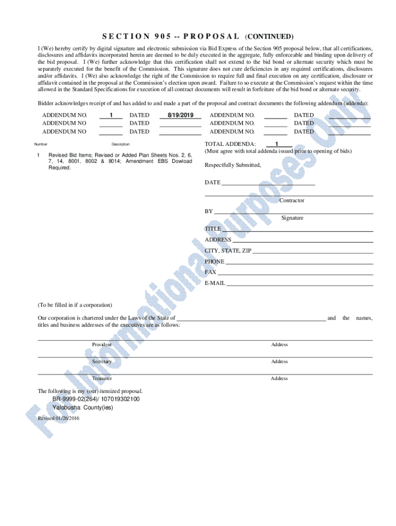 S E C T I O N 9 0 5 P R O P O S A L (CONTINUED) I (We) hereby certify by digital signature and electronic submission via Bid Express of the Section 905 proposal below, that all certifications, disclosures