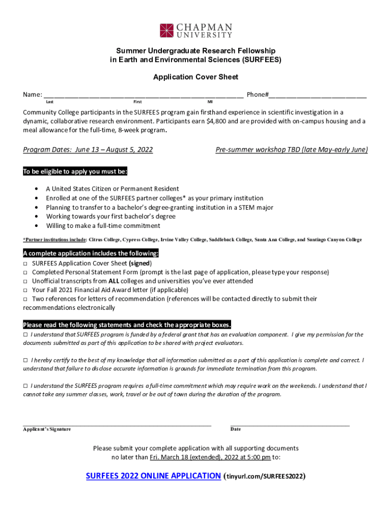 Get the free Summer Undergraduate Research Fellowship (SURF)Stanford UniveSummer Undergraduate Re...