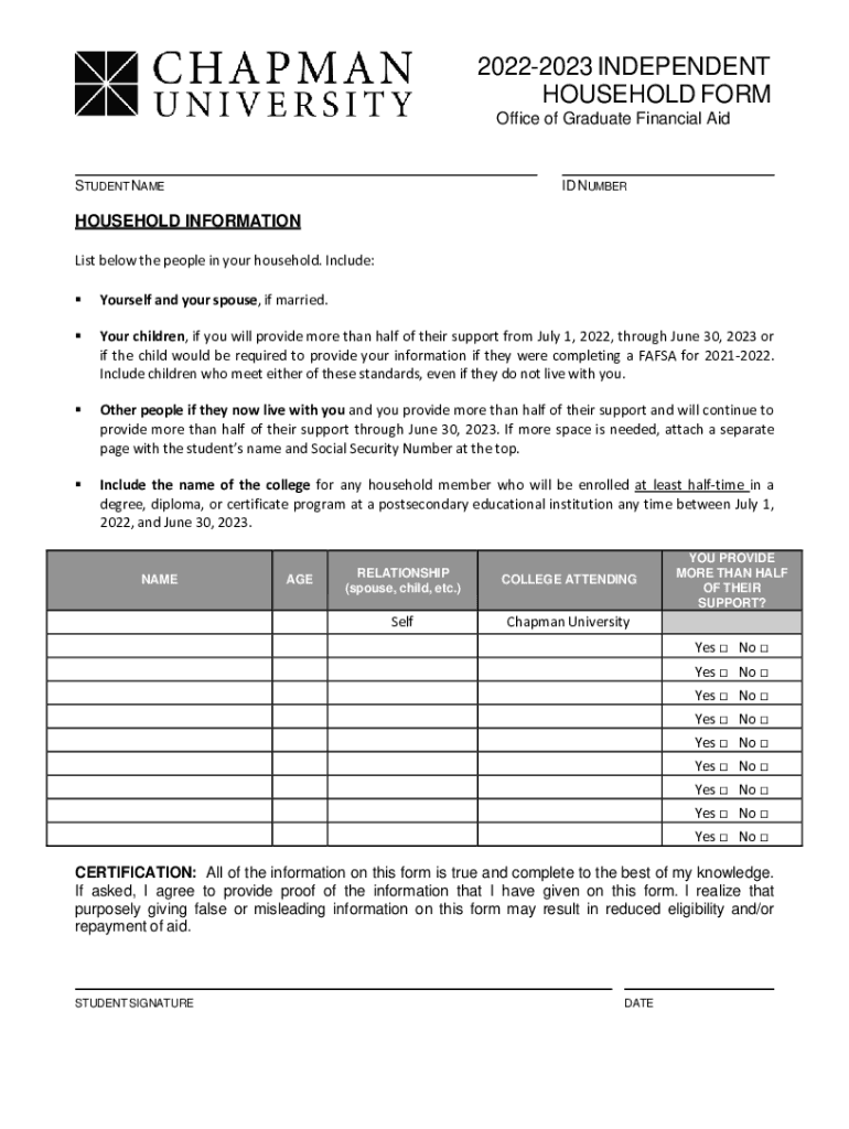 20222023 INDEPENDENT HOUSEHOLD FORM Offices of Graduate Financial Student NAMED NUMBERHOUSEHOLD INFORMATION List below the people in your household. Include: Yourself and your spouse, if married.