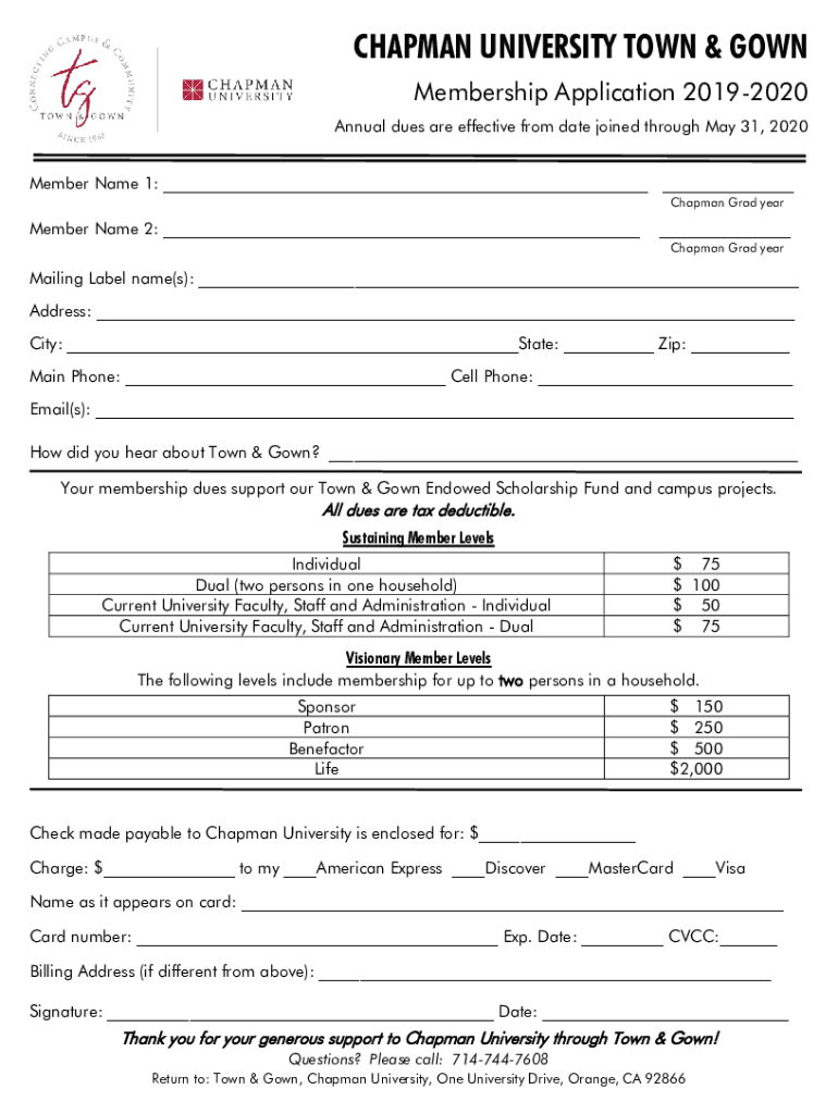CHAPMAN UNIVERSITY TOWN & GOWN Membership Application 20192020 Annual dues are effective from date joined through May 31, 2020, Member Name 1: ___ ___ Chapman Grad remember Name 2: ______ Chapman
