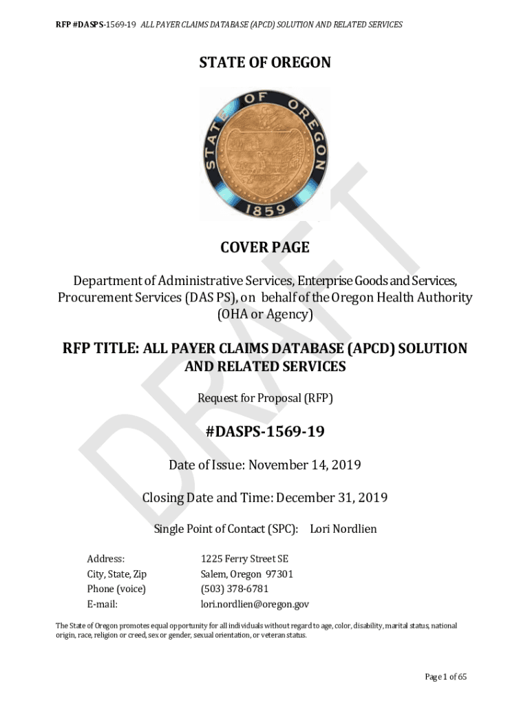 RFP #DASPS156919 ALL PAYER CLAIMS DATABASE (APC) SOLUTION AND RELATED SERVICESSTATE OF OREGONCOVER PAGE Department of Administrative Services, Enterprise Goods and Services, Procurement Services (DA