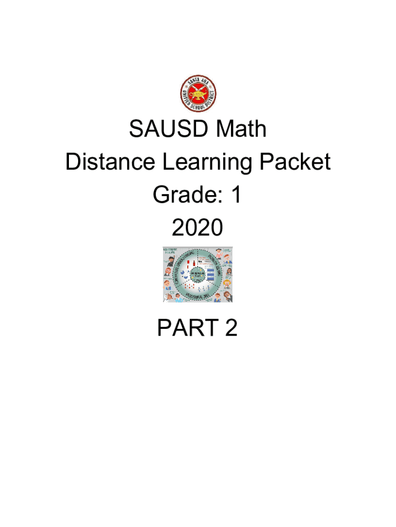 SA USD Math Distance Learning Packet Grade: 1 2020PART 2SAUSD Distance Learning Grade 1 Day 1Math: pages 15 (odd number problems)Day 2Math: pages 610 (odd number problems)Day 3Math: pages 1115 (odd