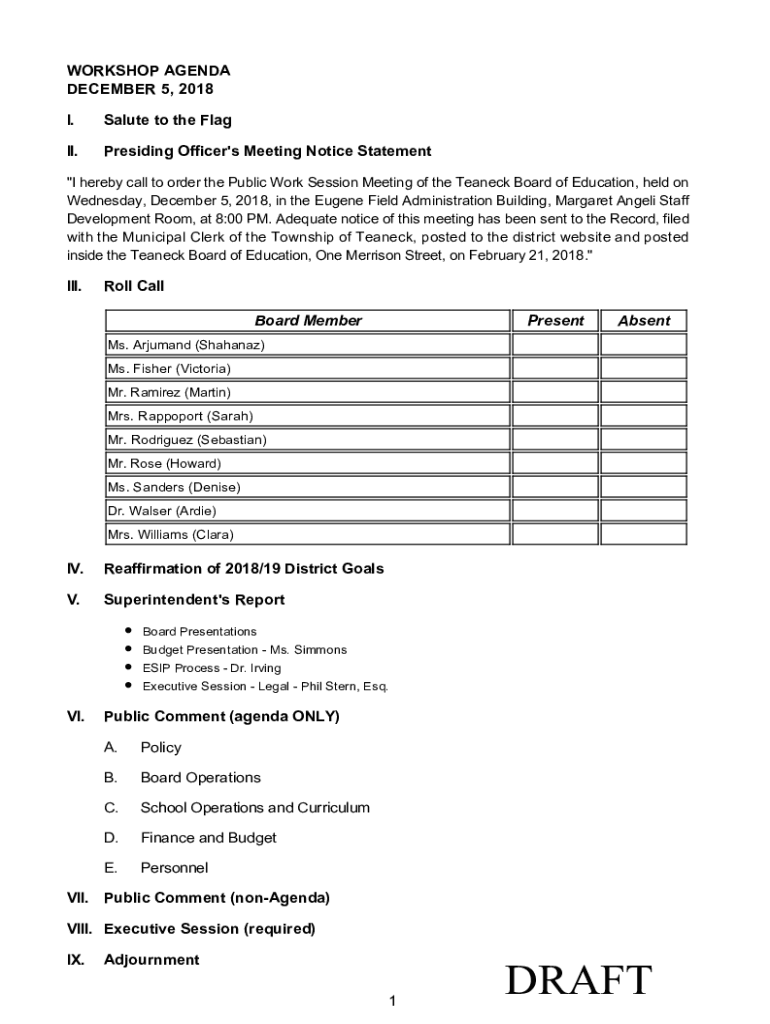 WORKSHOPAGENDA DECEMBER5,2018 I. SalutetotheFlagII. PresidingOfficer\'sMeetingNoticeStatement\” IherebycalltoorderthePublicWorkSessionMeetingoftheTeaneckBoardofEducation, Sheldon Wednesday,December5,2018,intheEugeneFieldAdministrationBuilding,