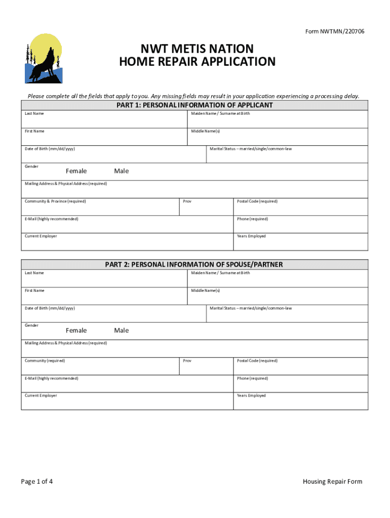 Form NW TMN/220706NWT MÉTIS NATION HOME REPAIR APPLICATION Please complete all the fields that apply to you. Any missing fields may result in your application experiencing a processing delay. PART