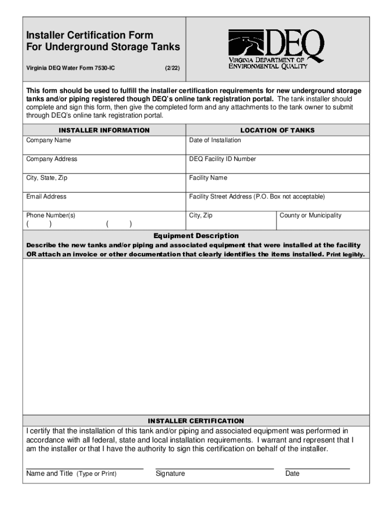 Installer Certification Form For Underground Storage Tanks Virginia DEQ Water Form 7530IC(2/22)This form should be used to fulfill the installer certification requirements for new underground storage