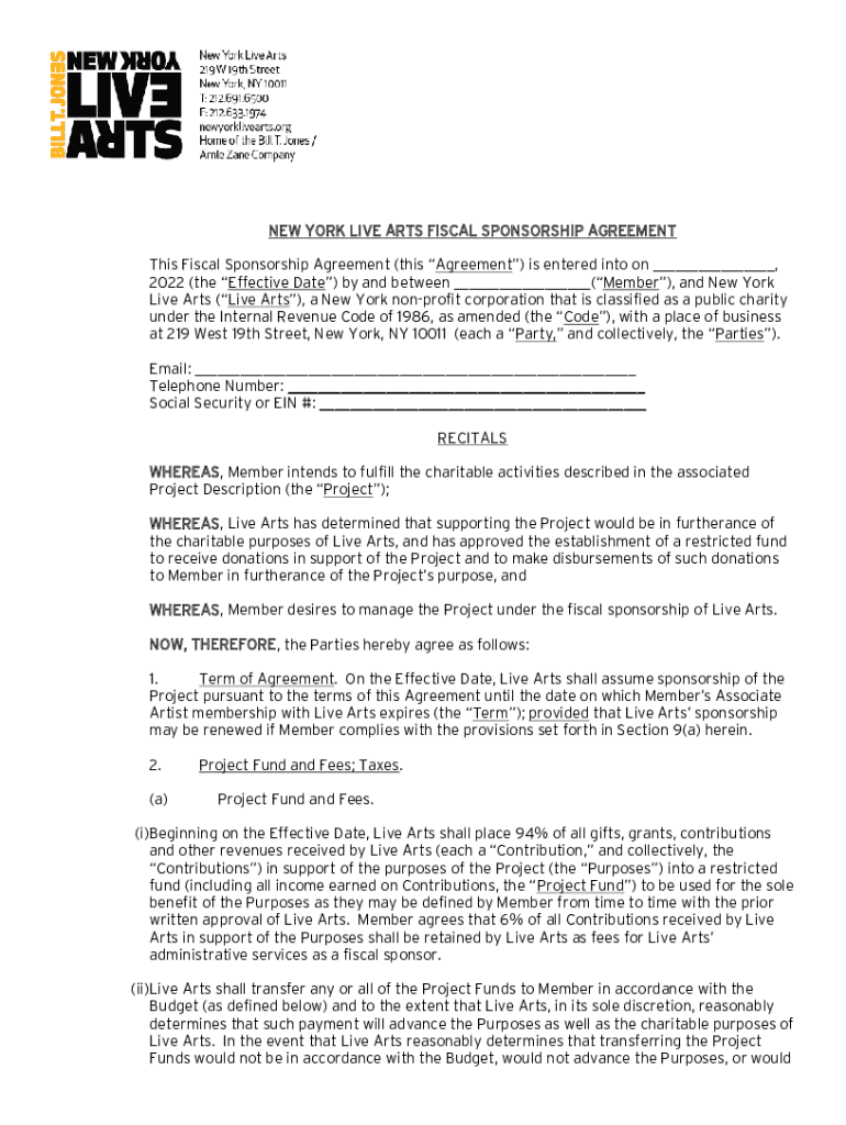 NEW YORK LIVE ARTS FISCAL SPONSORSHIP AGREEMENT This Fiscal Sponsorship Agreement (this Agreement) is entered into on ___, 2022 (the Effective Date) by and between ___(Member), and New York Live Arts