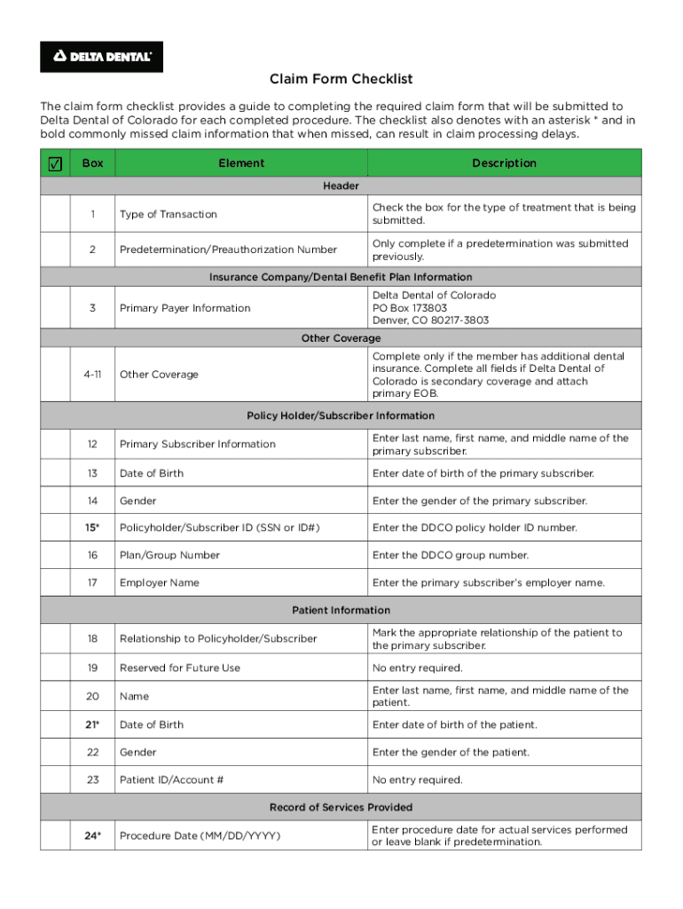 Claim Form Checklist The claim form checklist provides a guide to completing the required claim form that will be submitted to Delta Dental of Colorado for each completed procedure. The checklist