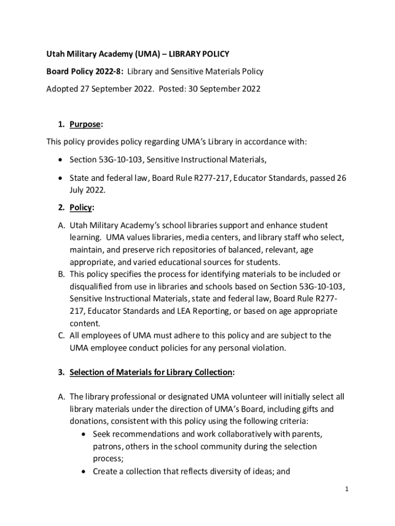 Utah Military Academy (UMA) LIBRARY POLICY Board Policy 20228: Library and Sensitive Materials Policy Adopted 27 September 2022. Posted: 30 September 20221. Purpose: This policy provides policy regarding