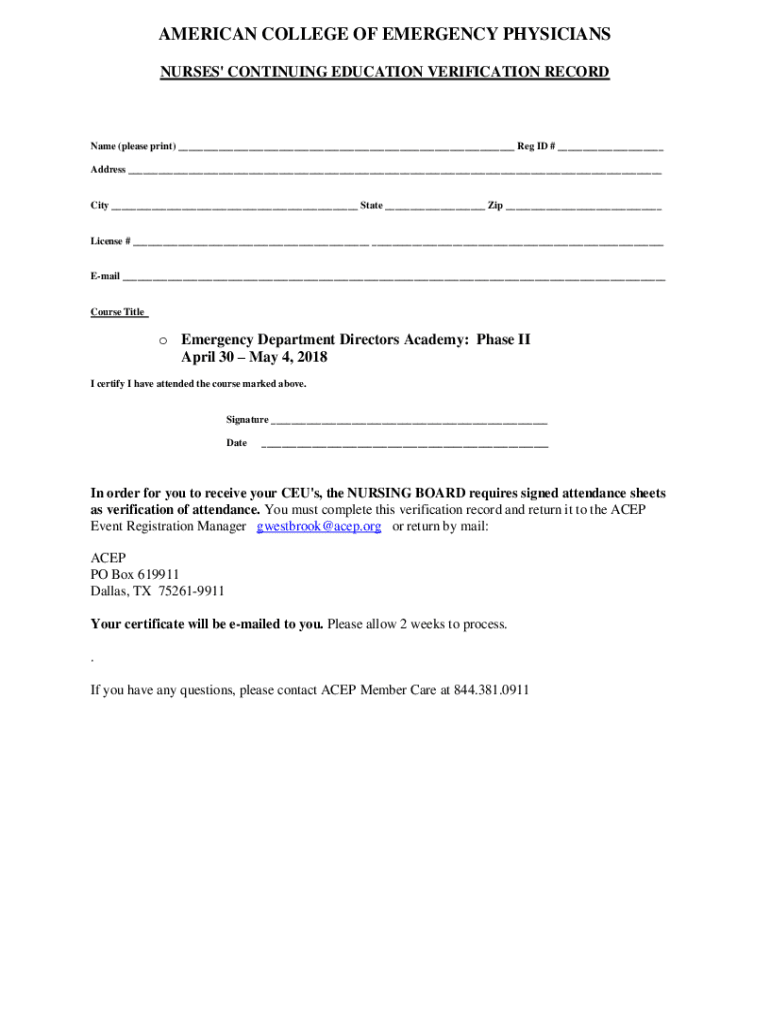 AMERICAN COLLEGE OF EMERGENCY PHYSICIANS NURSES\' CONTINUING EDUCATION VERIFICATION Recordable (please print) ___ Reg ID # ___ Address ___City ___ State ___ Zip ___License # ___ ___Email ___Course