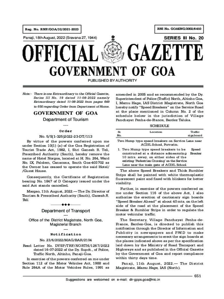 RNA No. GOING/2002/6410Reg. No. RNA/GOA/32/20212023SERIES III No. 20Panaji, 18th August 2022 (Havana 27, 1944)PUBLISHED BY AUTHORITYNote: There is one Extraordinary to the Official Gazette,