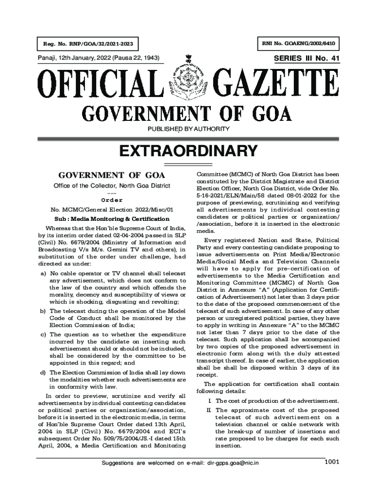 RNA No. GOING/2002/6410Reg. No. RNA/GOA/32/20212023SERIES III No. 41Panaji, 12th January 2022 (Paula 22, 1943)PUBLISHED BY AUTHORITYEXTRAORDINARY GOVERNMENT OF GOA Office of the Collector, North Goa