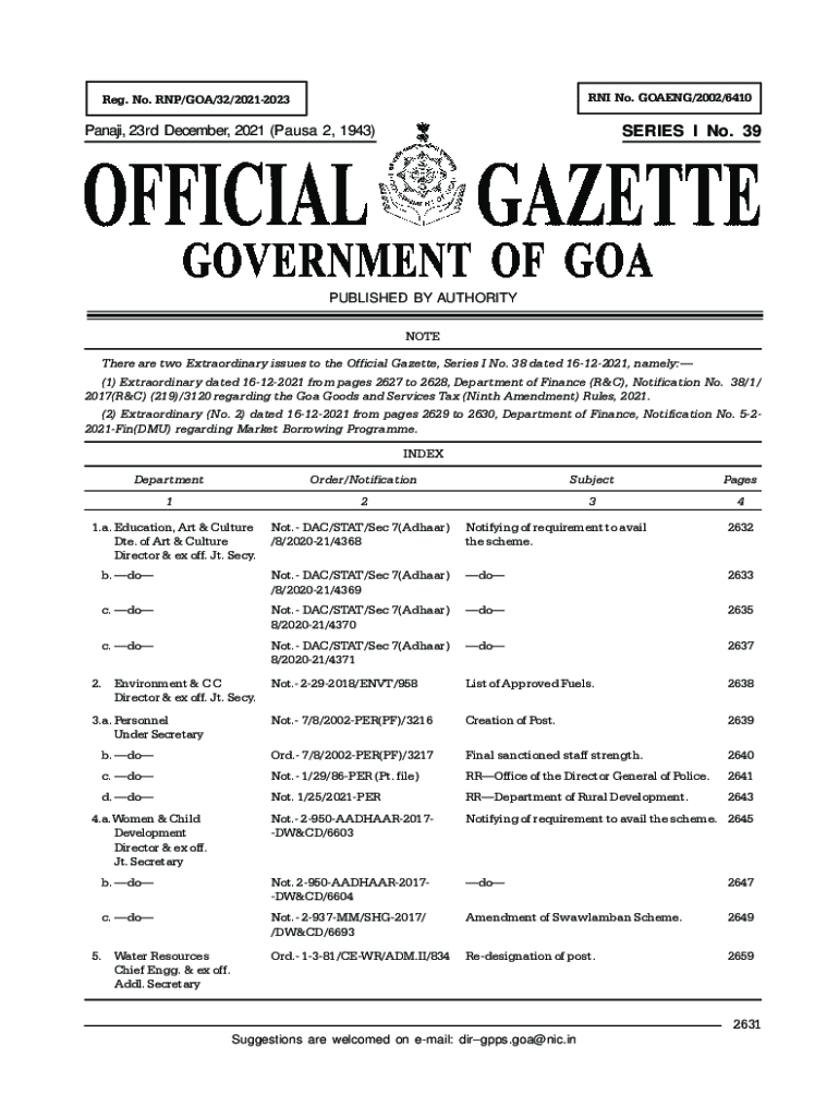 RNA No. GOING/2002/6410Reg. No. RNA/GOA/32/20212023Panaji, 23rd December 2021 (Paula 2, 1943)SERIES I No. 39PUBLISHED BY AUTHORITY NOTE There are two Extraordinary issues to the Official Gazette,