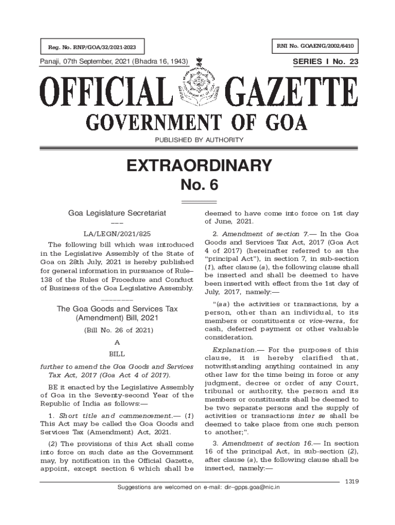 RNA No. GOING/2002/6410Reg. No. RNA/GOA/32/20212023SERIES I No. 23Panaji, 07th September 2021 (Chandra 16, 1943)PUBLISHED BY AUTHORITYEXTRAORDINARY No. 6 Goa Legislature Secretariat. LA/LEG/2021/825