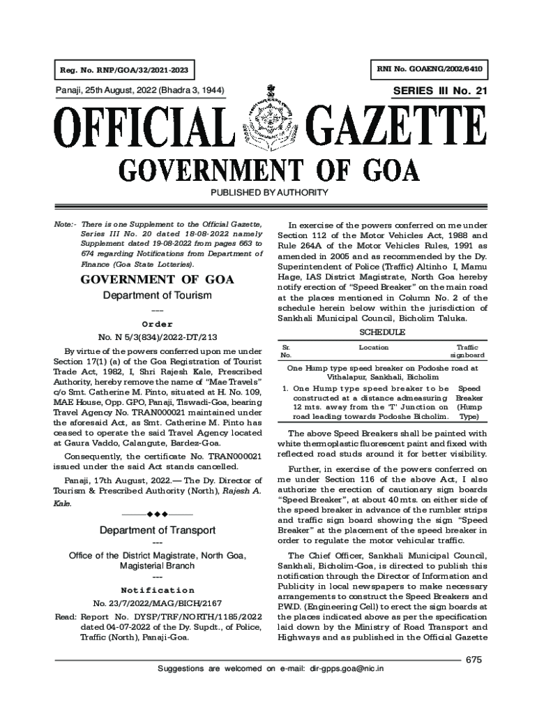 RNA No. GOING/2002/6410Reg. No. RNA/GOA/32/20212023SERIES III No. 21Panaji, 25th August 2022 (Chandra 3, 1944)PUBLISHED BY AUTHORITYNote: There is one Supplement to the Official Gazette, Series III