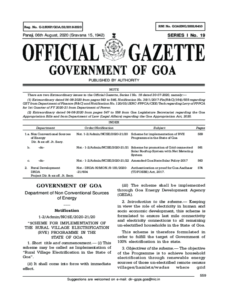 RNA No. GOING/2002/6410Reg. No. G2/RNA/GOA/32/20182020SERIES I No. 19Panaji, 06th August 2020 (Havana 15, 1942)PUBLISHED BY AUTHORITY NOTE There are two Extraordinary issues to the Official Gazette,