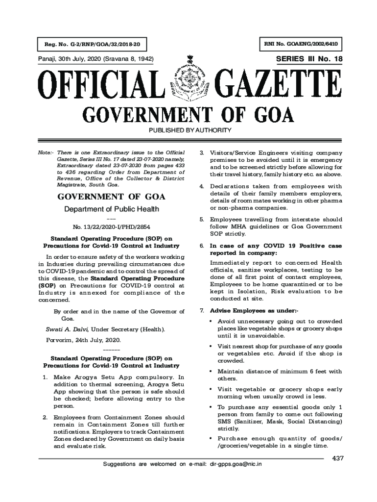RNA No. GOING/2002/6410Reg. No. G2/RNA/GOA/32/201820SERIES III No. 18Panaji, 30th July 2020 (Havana 8, 1942)PUBLISHED BY AUTHORITYNote: There is one Extraordinary issue to the Official Gazette, Series