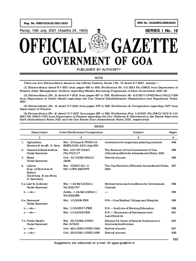 RNA No. GOING/2002/6410Reg. No. RNA/GOA/32/20212023SERIES I No. 16Panaji, 15th July 2021 (Agatha 24, 1943)PUBLISHED BY AUTHORITY NOTE There are four Extraordinary issues to the Official Gazette, Series