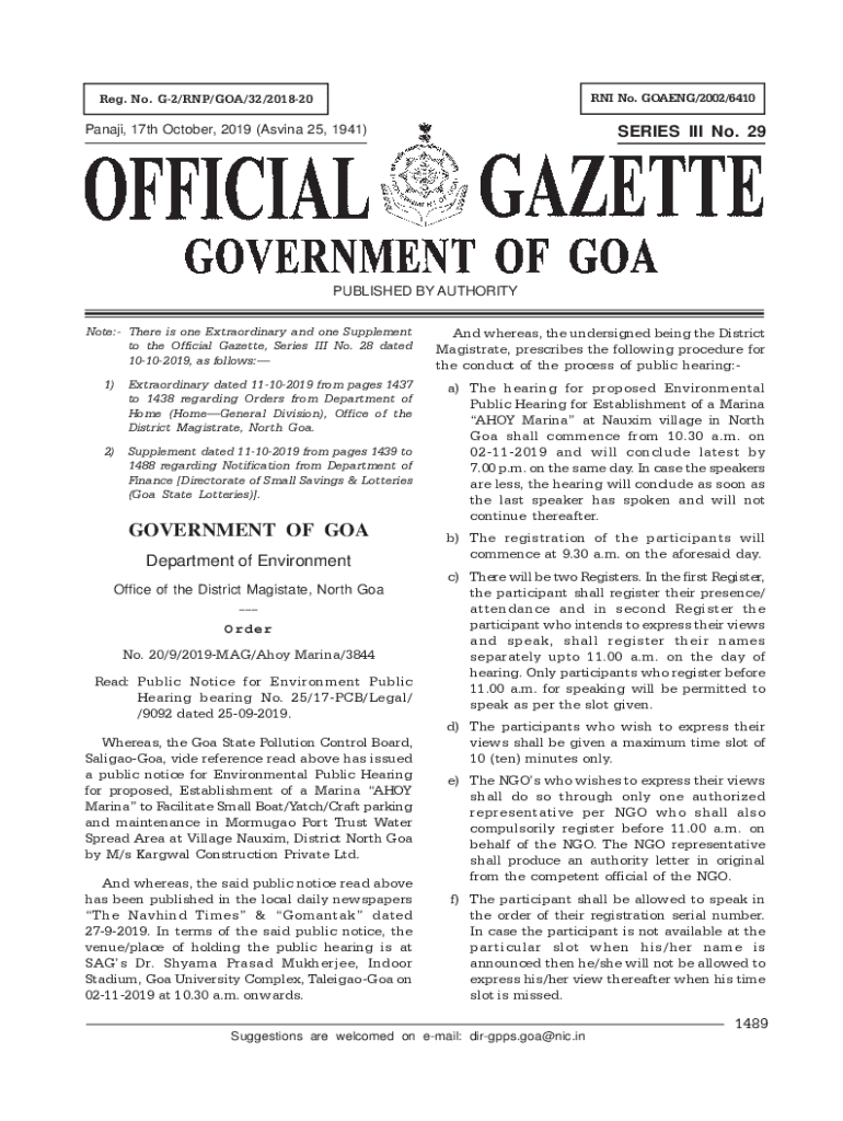 RNA No. GOING/2002/6410Reg. No. G2/RNA/GOA/32/201820Panaji, 17th October 2019 (Asia 25, 1941)SERIES III No. 29PUBLISHED BY AUTHORITY Note: There is one Extraordinary and one Supplement to the Official