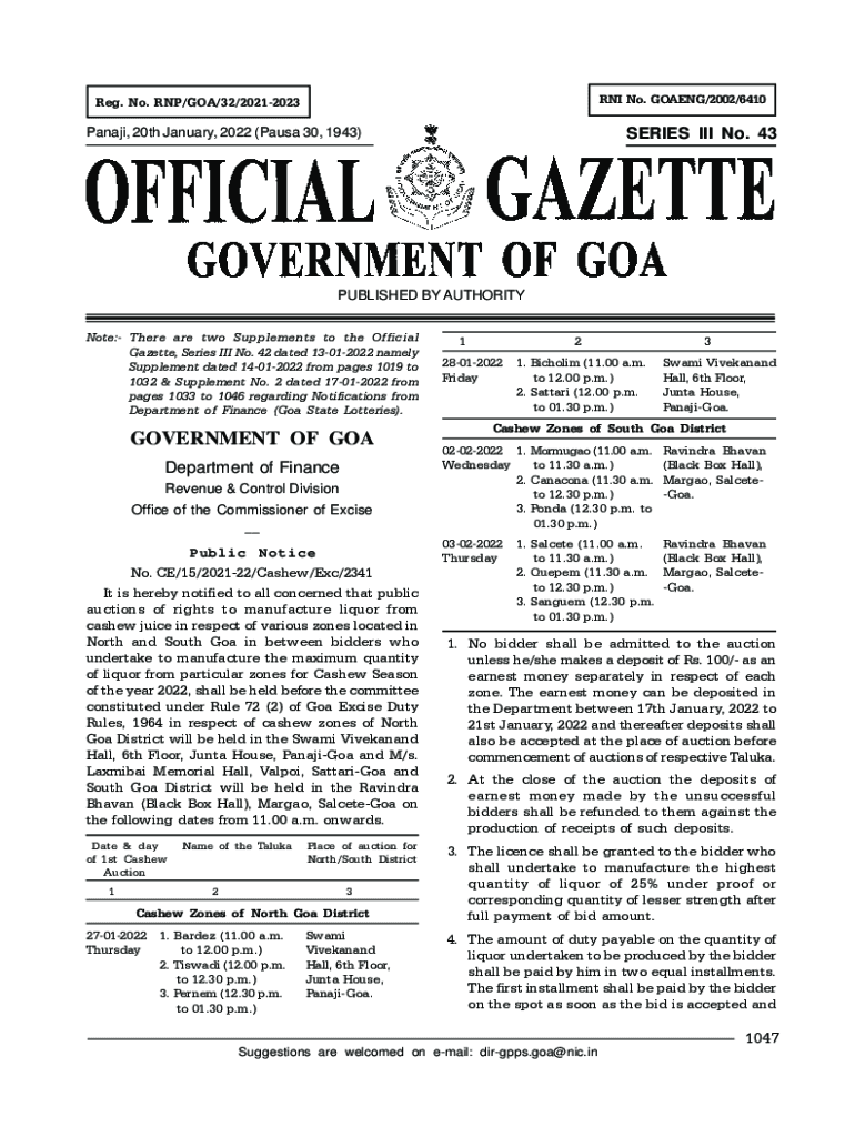 RNA No. GOING/2002/6410Reg. No. RNA/GOA/32/20212023SERIES III No. 43Panaji, 20th January 2022 (Paula 30, 1943)PUBLISHED BY AUTHORITY Note: There are two Supplements to the Official Gazette, Series