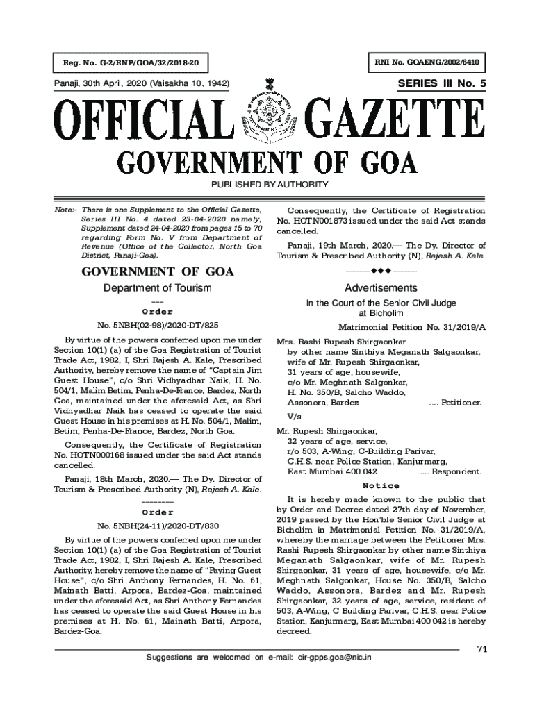 RNA No. GOING/2002/6410Reg. No. G2/RNA/GOA/32/201820SERIES III No. 5Panaji, 30th April 2020 (Aisha 10, 1942)PUBLISHED BY AUTHORITY Note: There is one Supplement to the Official Gazette, Series III