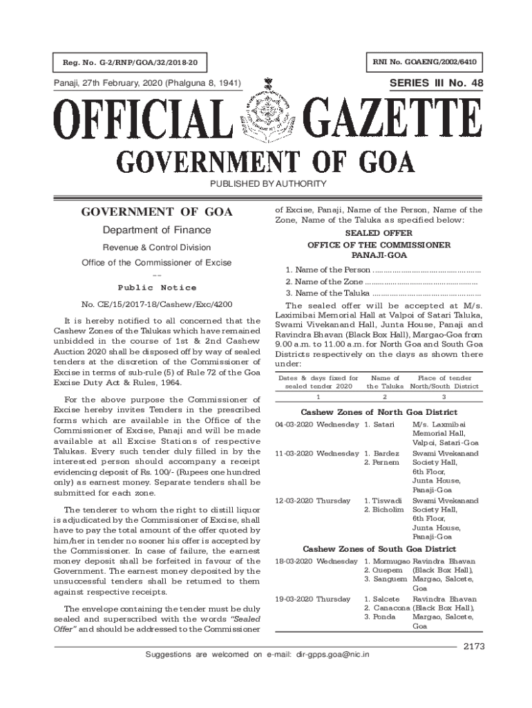 RNA No. GOING/2002/6410Reg. No. G2/RNA/GOA/32/201820SERIES III No. 48Panaji, 27th February 2020 (Phalanx 8, 1941)PUBLISHED BY AUTHORITYGOVERNMENT OF Goof Excise, Panama, Name of the Person, Name of