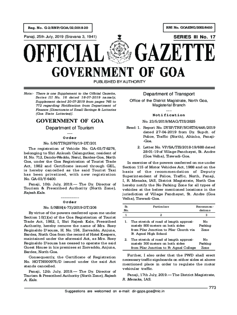 RNA No. GOING/2002/6410Reg. No. G2/RNA/GOA/32/201820SERIES III No. 17Panaji, 25th July 2019 (Havana 3, 1941)PUBLISHED BY AUTHORITYDepartment of Transportable: There is one Supplement to the Official