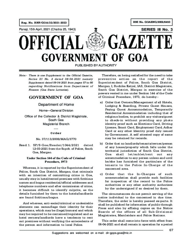 RNA No. GOING/2002/6410Reg. No. RNA/GOA/32/20212023SERIES III No. 3Panaji, 15th April 2021 (Chair 25, 1943)PUBLISHED BY AUTHORITY Note: There is one Supplement to the Official Gazette, Series III