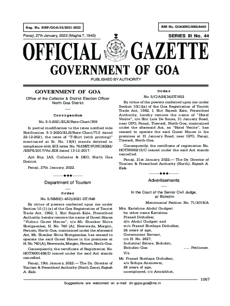 RNA No. GOING/2002/6410Reg. No. RNA/GOA/32/20212023SERIES III No. 44Panaji, 27th January 2022 (Mafia 7, 1943)PUBLISHED BY AUTHORITYGOVERNMENT OF GOA Office of the Collector & District Election Officer