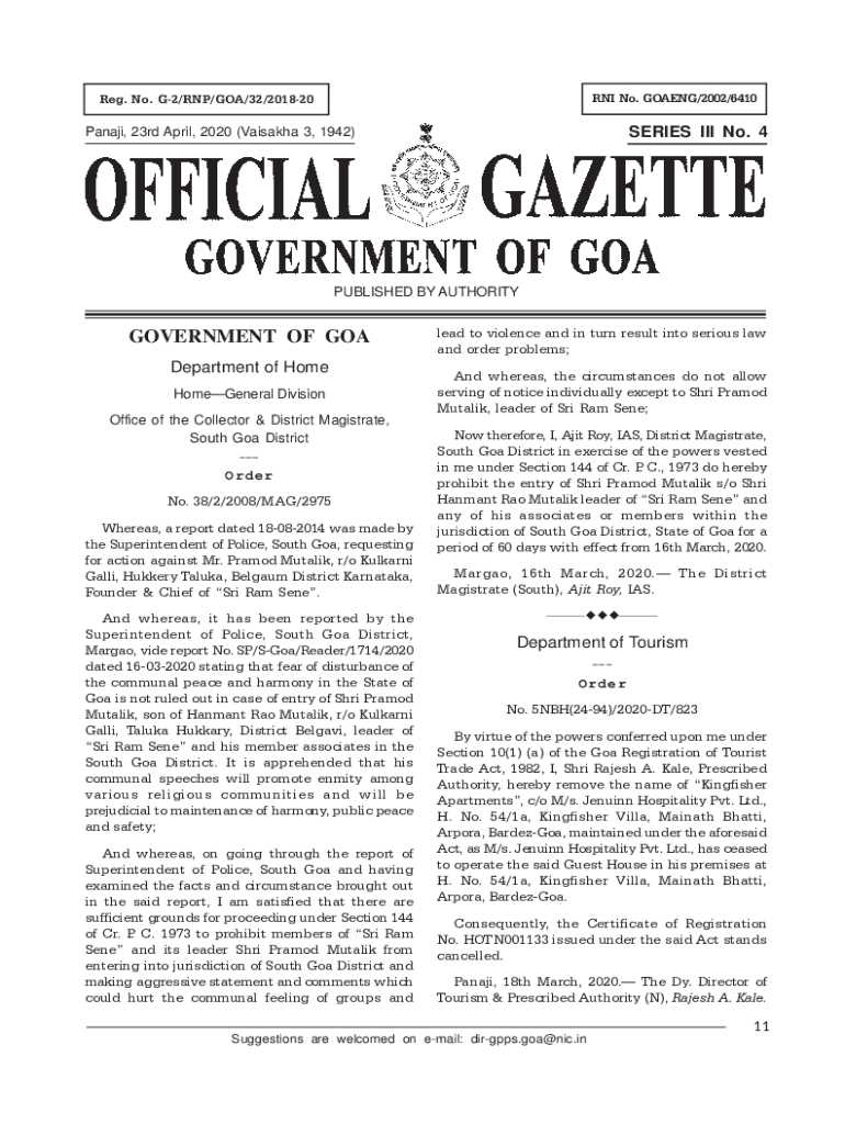 RNA No. GOING/2002/6410Reg. No. G2/RNA/GOA/32/201820SERIES III No. 4Panaji, 23rd April 2020 (Aisha 3, 1942)PUBLISHED BY AUTHORITYGOVERNMENT OF GOA Department of Home HomeGeneral Division Office of