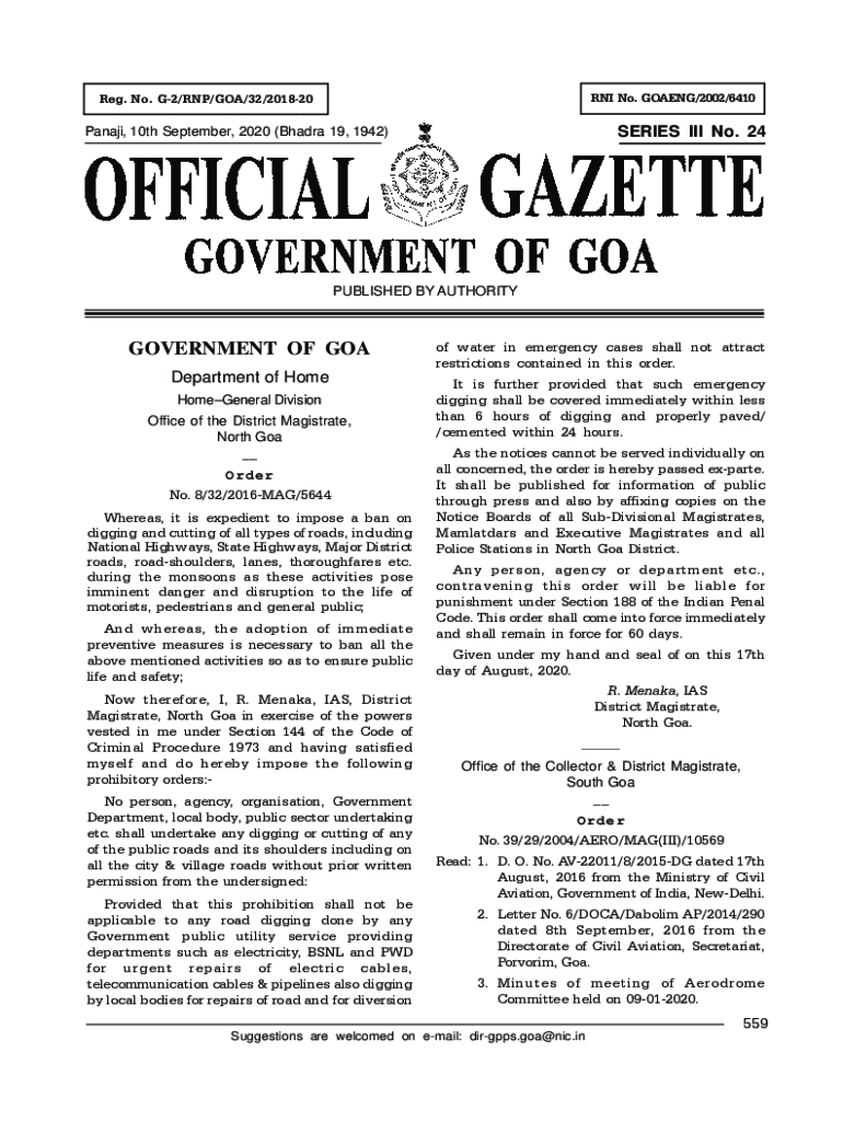 RNA No. GOING/2002/6410Reg. No. G2/RNA/GOA/32/201820SERIES III No. 24Panaji, 10th September 2020 (Chandra 19, 1942)PUBLISHED BY AUTHORITYGOVERNMENT OF GOA Department of Home HomeGeneral Division Office