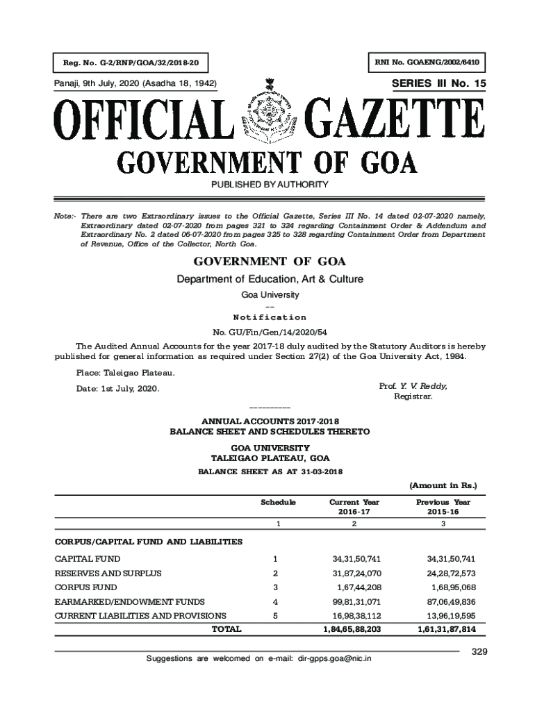 RNA No. GOING/2002/6410Reg. No. G2/RNA/GOA/32/201820SERIES III No. 15Panaji, 9th July 2020 (Agatha 18, 1942)PUBLISHED BY AUTHORITYNote: There are two Extraordinary issues to the Official Gazette,
